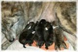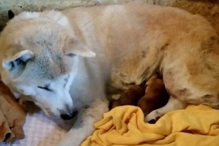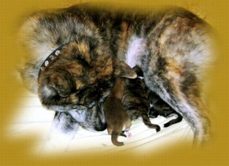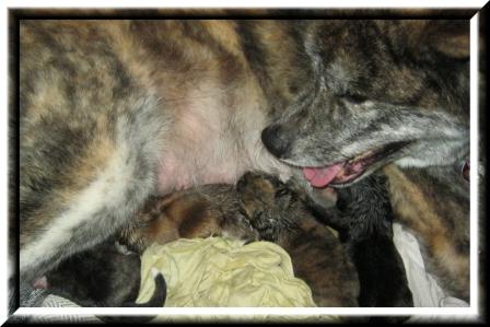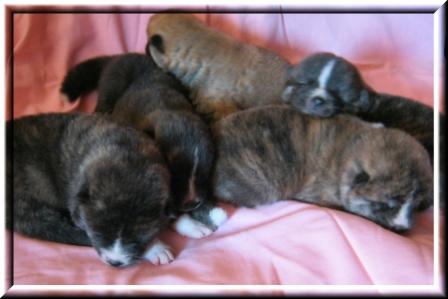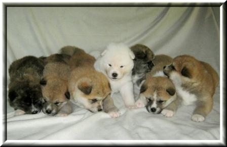 19.06.2010 Der Juni stand ganz im Zeichen der Wurfvorbereitungen, - neue große Wurfkiste bauen, Welpenzimmer einrichten - neues Haus neue Sitten. Alle, - wir und die Hunde in Vorbereitungen. *** Die Wochenenden bestückt mit neuen Akita-Fan´s (...das sogenannte "Akita Live" - Kaffeetrinken mit vielen neuen auch interessanten Leuten und absoluten Akita-Fan´s). Die Hundefamilie wächst. *** Ja und dann die letzten Tage, - wann ist es denn soweit - nun, es bestand ja nie die Frage: "Ist sie denn nun tragend - nein, eigentlich immer nur das Rätsel, - wie viele werden es wohl?" Spannung pur - Ichi hat gewartet bis zum letzten Tag: Pünktlich 19.06.2010 um 0:07 Uhr kam der erste Welpen. *** Endresultat nach einer natürlichen, gelungenen Geburt: Mal wieder 7 - also wieder die glorreichen Sieben / Part Two, aber diesmal natürlich andere Farben. 4x brindel: 2 Rüden, 2 Hündinnen*** 3x weiß: 3 Hündinnen. *** Ein gelungener, harmonischer Wurf. *** Unsere Ichi hat es wieder gut gemacht und ist wieder eine stolze Mama. *** Mutter und Welpen sind fit, wohlauf und glücklich. *** Das Restrudel gratuliert ebenfalls und hat die neue Schar schon erfreut für gut befunden. *** To be continued ...